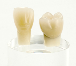 削った歯の型をとり、その歯型によってセラミックで作製したクラウンを合わせて、歯の色や形、歯並びなどの審美的要素をバランス良く修復し改善するものです。セラミックの持つ特殊な材質を十分に生かし、本来の健康な歯と同じかそれ以上の色や形を再現しますので、きわめて審美的効果が高い方法と言えます。